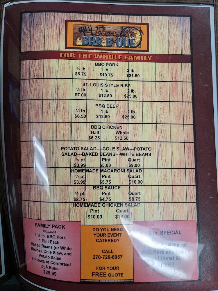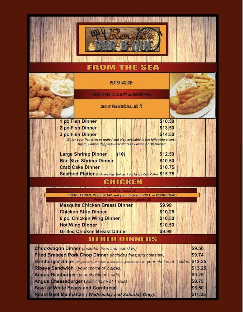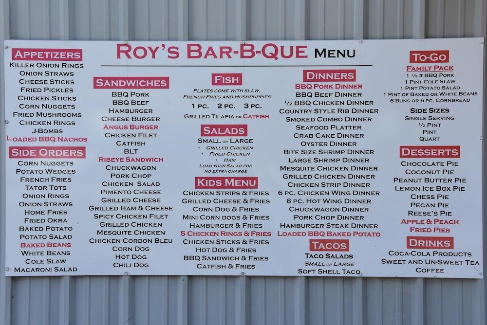 The menu at Roy's Bar-B-Que offers a wide range of Southern classics. Signature dishes include pulled pork, smoked ribs, and fried chicken. Sides like baked beans, coleslaw, and corn nuggets complement the main courses. For lighter options, try salads and wraps. Don't skip the children's menu, designed for their taste buds. The dessert section is a must, featuring delicious homemade pies ranging from apple to peach. Overall, the menu combines comfort food with local staples, appealing to various tastes. With reasonable prices, diners experience generous portions and hearty flavors in every dish.